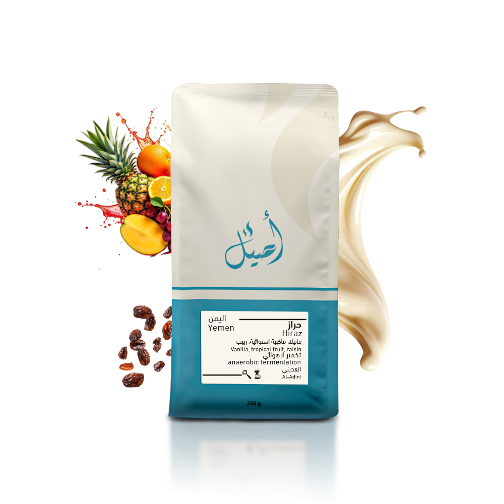 محصول اليمن - حراز:المنطقة: حراز.المعالجة: تخمير لا هوائي.السلالة: العديني.الارتفاع: 2300 متر فوق سطح البحر.الإيحاءات: فانيلا - فواكه استوائية - زبيب.الاستخدام: تقطير - إسبريسوالحجم: 250 غ.