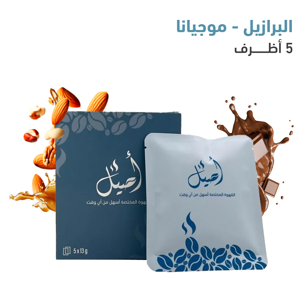 عبوة أنيقة تحتوي على 5 أظرف.محصول بن البرازيل - موجيانا. إيحاءات كراميل وشوكولاته ومكسرات. معالج بالتجفيف.سلالة بوربون.قهوة مقطرة.وزن 13 جرام لكل ظرف.